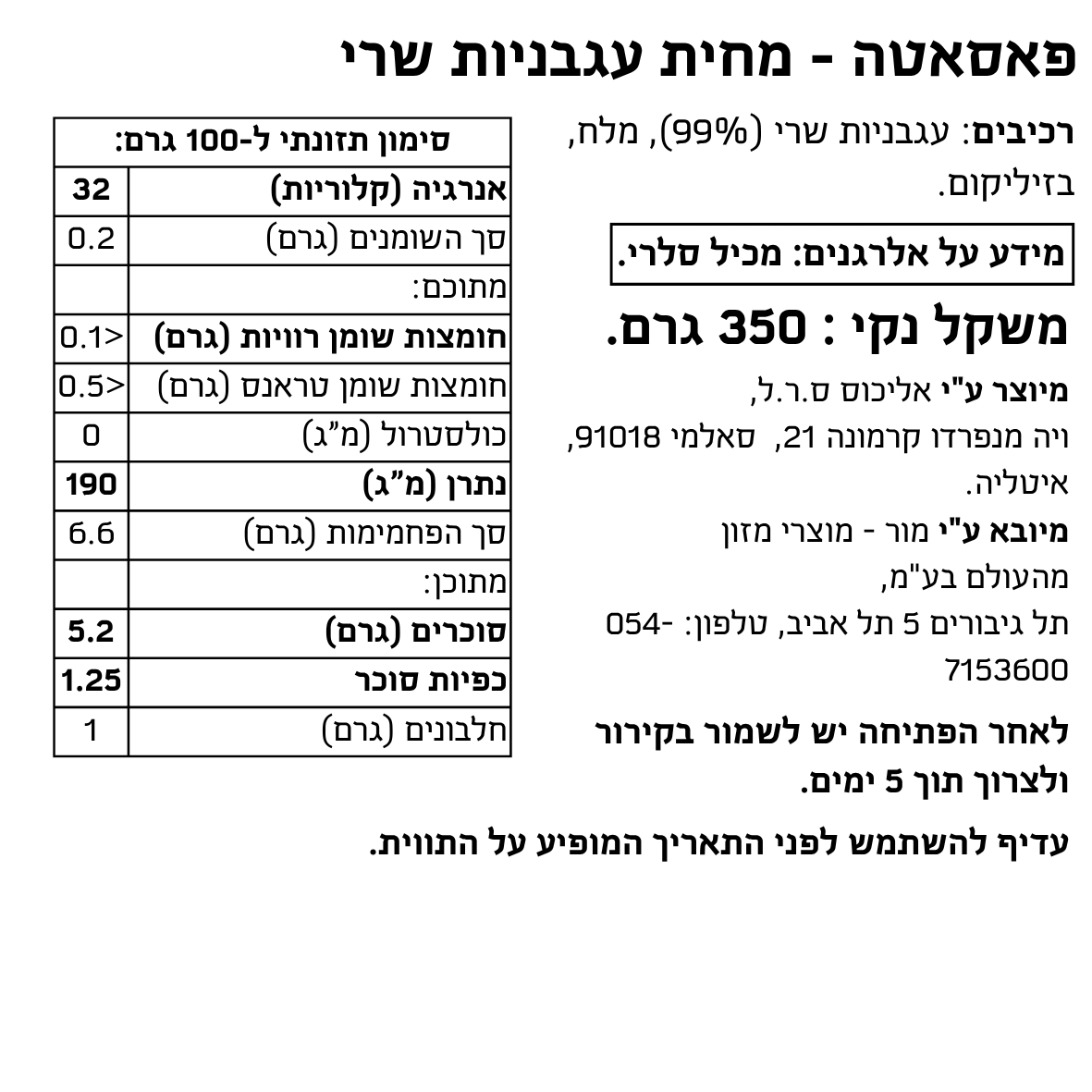 לאחר ֿהפתיחה יש לשמור בקירור ולצרוך תוך 5 ימים